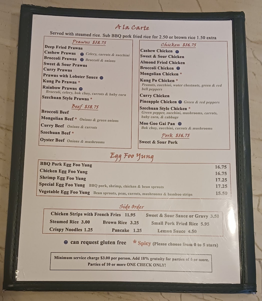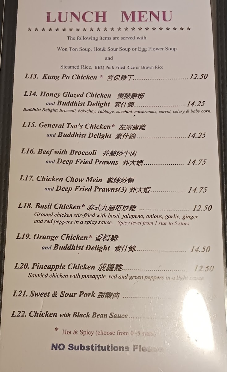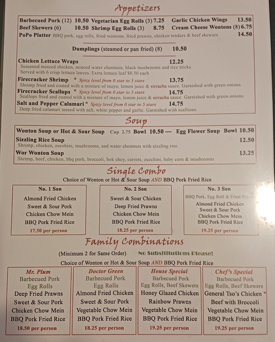 The menu at Chan's Place in Woodinville offers a straightforward yet satisfying selection typical of a comfortable Chinese-American dining spot. It features a variety of soups, noodle dishes, and classic entrées that suit both a casual lunch and a relaxed dinner setting. The dishes range from warming bowls like Hot & Sour Soup and Wor Wonton Soup to sharing-friendly plates such as General TSO's Chicken and Firecracker Shrimp.